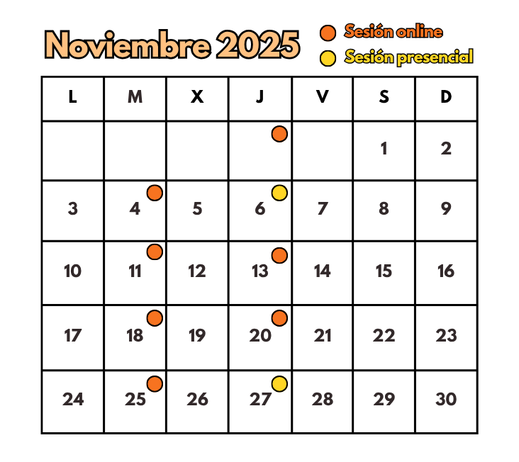 Noviembre: Días 4, 11, 13, 18, 20, 25. (de 16:30h a 18:30h).