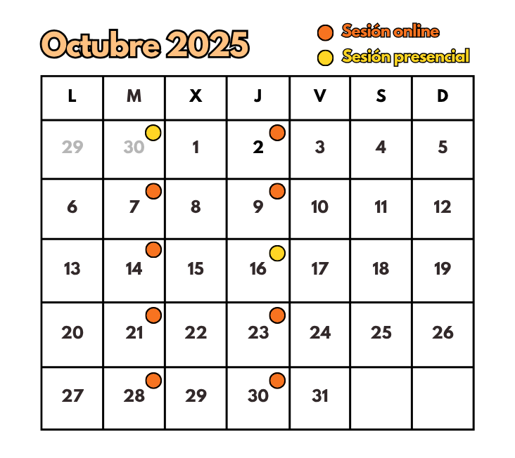 Octubre: Días 2, 7 ,9 ,14 ,21, 23, 28, 30. (de 16:30h a 18:30h).